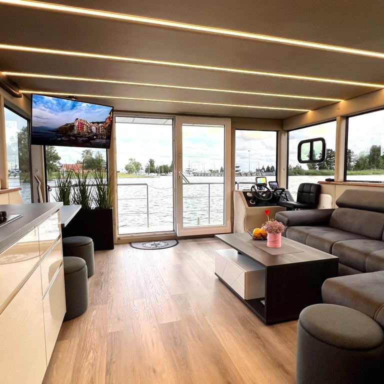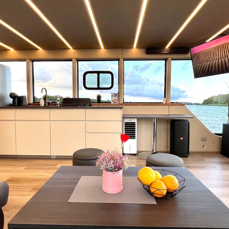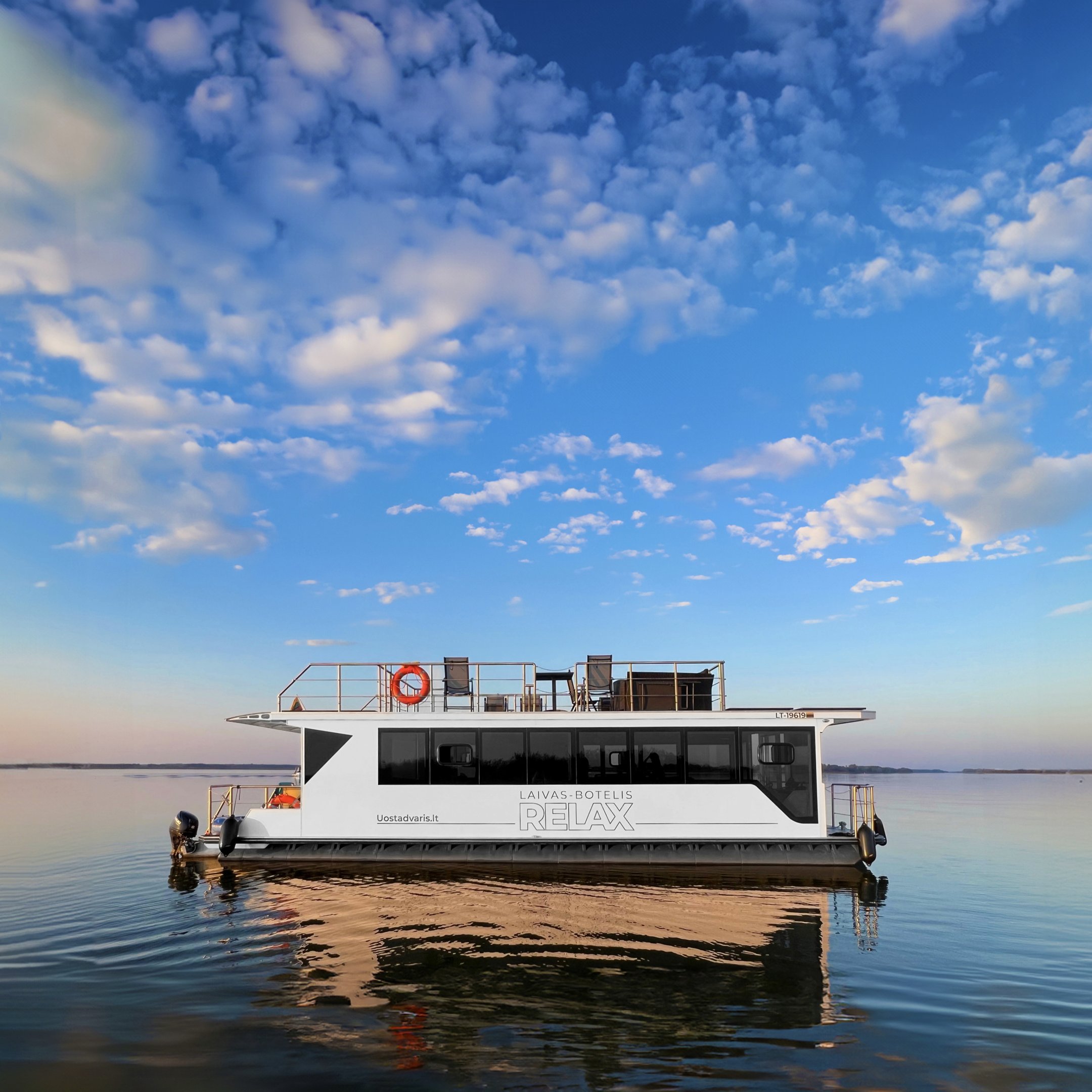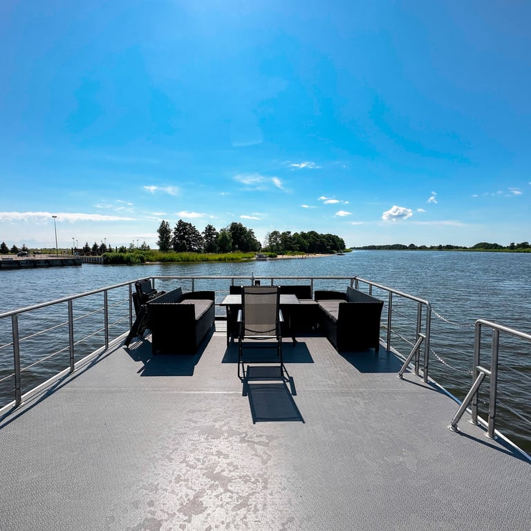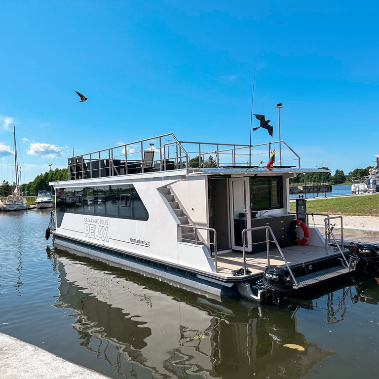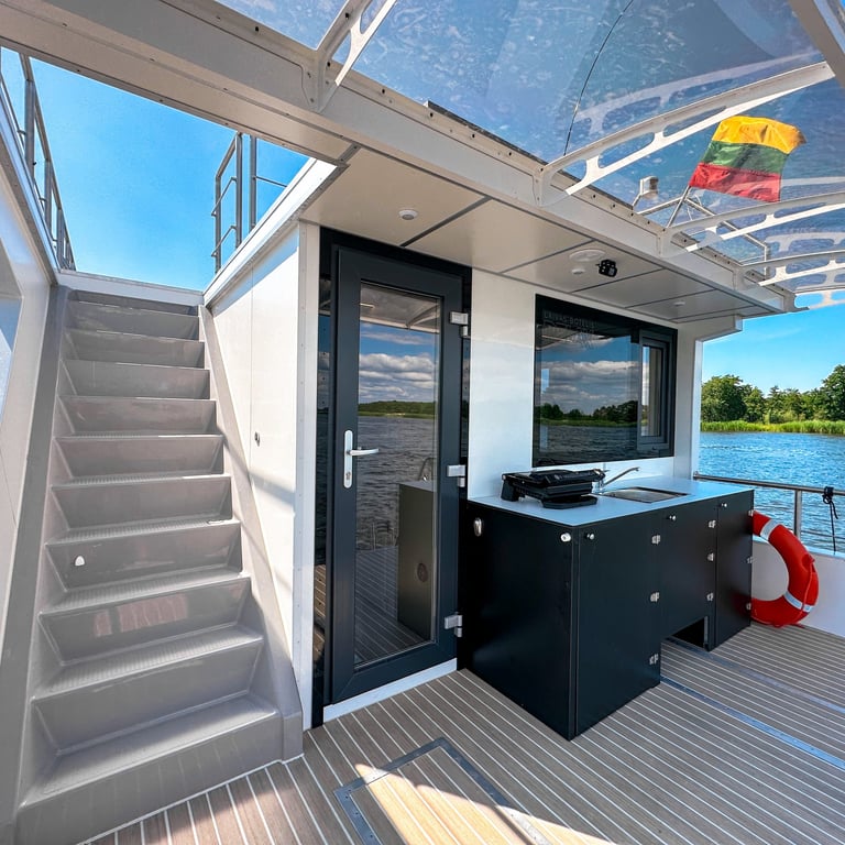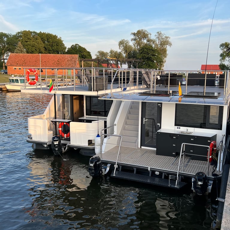 Šis modernus ir autonomiškas dviaukštis laivas sukurtas Jūsų maloniam laisvalaikiui ant vandens. Pirmame aukšte įrengta erdvi poilsio zona su kompaktiška virtuve, dviem miegamaisiais ir vonios kambariu. Erdvūs galiniai ir priekiniai deniai leis Jums mėgautis saulės spinduliais, tyru vėjo ošimu, Pamario paukšcių giesmėmis. Antrame šio išskirtinio laivo aukšte įrengta erdvi ir patogi lauko terasa patogiai stebėti kraštovaizdį ar tiesiog gulinėti ir mėgautis saulės spindulių terapija.