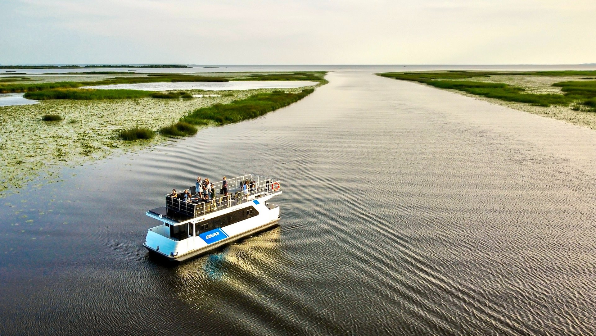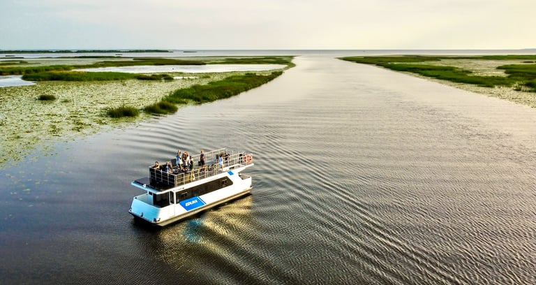 Jums grįžus į laivą pamažu leisimės į raminančią kelionę per Kuršių marias link Pamario krašto. Po 2 valandų kelionės pasieksime laukinės gamtos rojų ir vandens paukščių stovyklavietę - Kniaupo įlanką. Čia pasigrožėsime paukščiais ir gamtos ramybe, bei išskirtinumu. Sekančiai įplauksime į Upaitį, kuriuo pasieksime Medžiotojų taką (Jėgeriuką), plaukdami per jį dažnai pastebime bebrų namų, gulbių šeimynų, retkarčiais ir praplaukiančių briedžių. Praplaukę jį kirsime Atmatos upę ir lėta eiga grįšime į Uostadvario uostą.